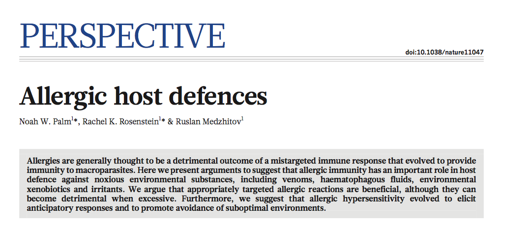 Ruslan Medzhitov, an immunologist at Yale, and his colleagues published a review of the evolutionary function of allergy in the journal Nature this week. This article proposes that the debilitating and sometimes deadly symptoms of allergy, including rhinitis, hives, allergic dermatitis, and bronchospasm, evolved as a host defense against environmental toxins.