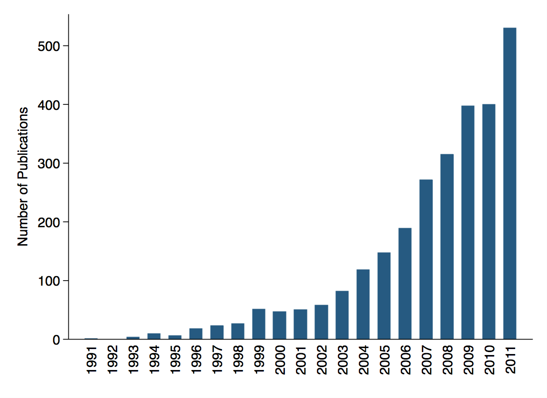 Publication in the area of Evolutionary Medicine is experiencing exponential growth. These are the number of annual publications with keywords “Evolutionary Medicine” between 1991 and 2011 in Google scholar:
