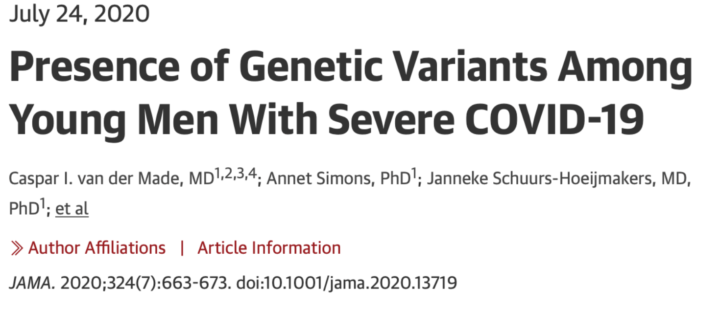 Severe COVID-19 seems to run in some families. Van der Made and colleagues studied 4 brothers from two unrelated families in which 2 pairs of brothers (ages 21-31) suffered severe cases of COVID-19. These researchers found that these brothers had a mutation in the gene encoding interferon, and had a markedly lower interferon response to infection. One of these unfortunate brothers with COVID-19 had a fulminant course, causing his death The others suffered complicated and severe disease involving mechanical ventilation. The likely reason for their poor outcomes: Mutations causing loss-of-function in X-chromosomal TLR7, linked with impaired type I and II IFN responses. This strongly indicates that lacking appropriate interferon responses can be deadly in COVID-19.