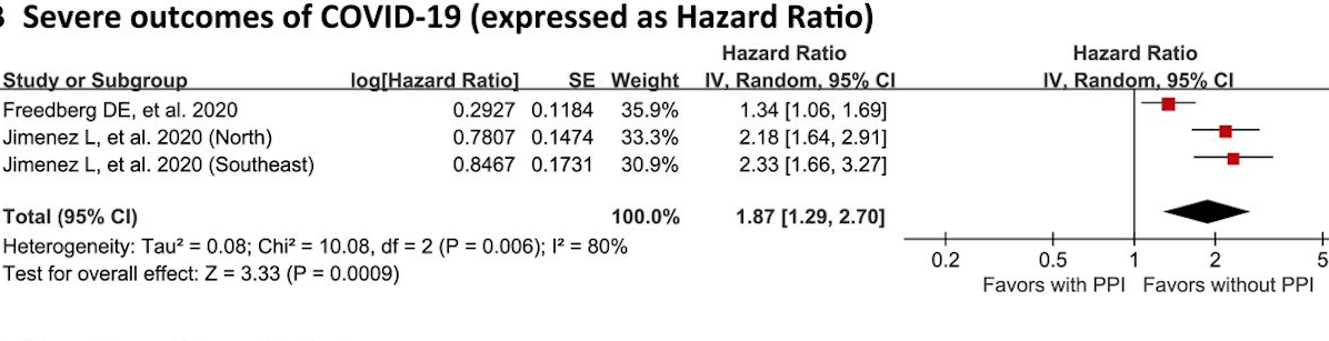 A recent study by Lee et al has shown another surprising risk for PPIs: In this study out of South Korea, patients with COVID-19 who were taking PPIs had a 1.6x increase risk for severe disease and death. Another meta-analysis showed a similarly increased risk: