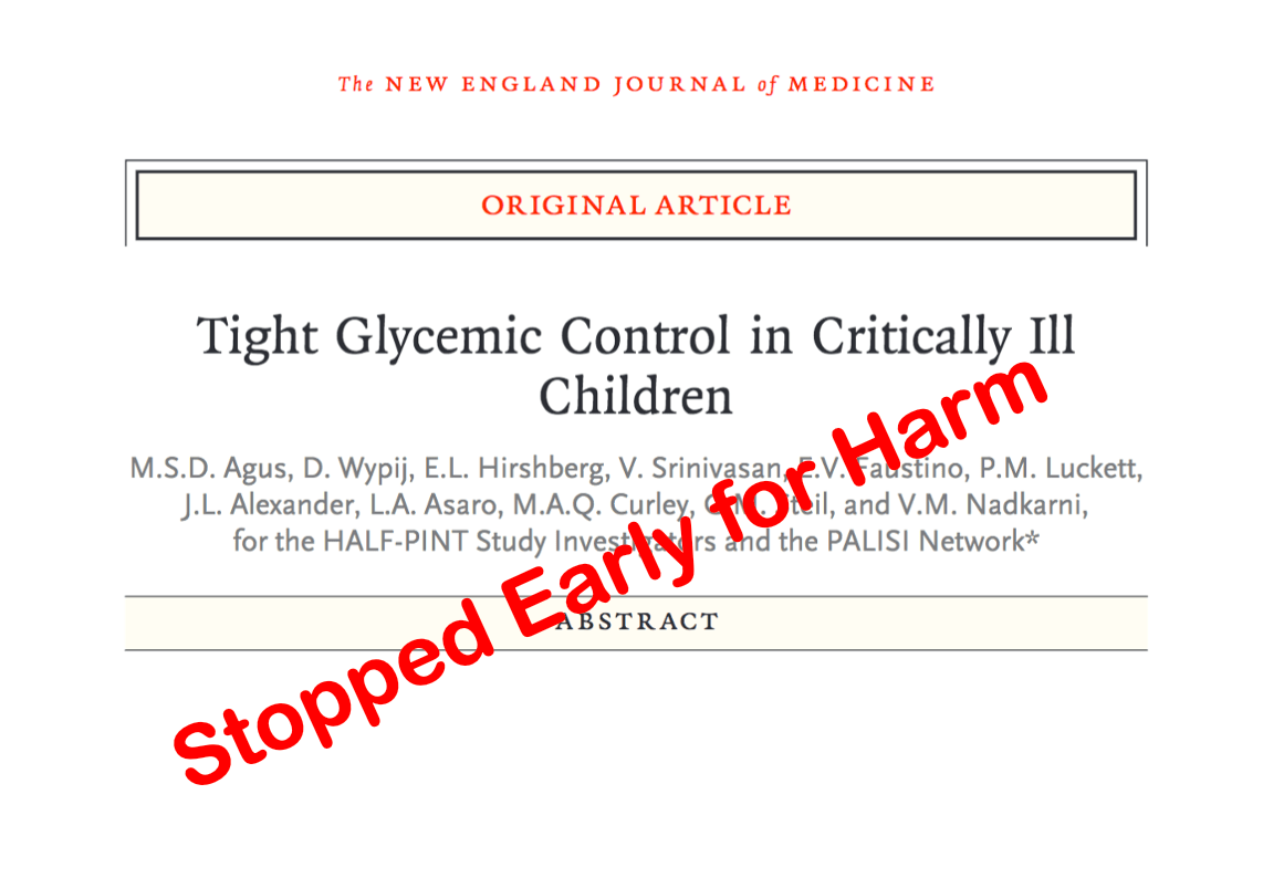 But subsequent research that involved far more patients in studies that were better designed (multi-center versus single center trials) contradicted the results of the studies Van den Berghe cited. A NEJM paper in 2008 showed harm from giving more insulin: Intensive insulin therapy in sepsis caused more complications with no survival benefit. This was followed by the NICE-SUGAR study that tested intensive insulin treatment, also called tight glycemic control, in 6000 adult critically ill patients. Unexpectedly, NICE-SUGAR showed that tight glycemic control increased mortality by 2.6%. Agus et al followed up on this result in a pediatric study of tight glycemic control in the intensive care unit. This study, published in the New England Journal in 2017, was stopped early because it also showed a signal of harm.