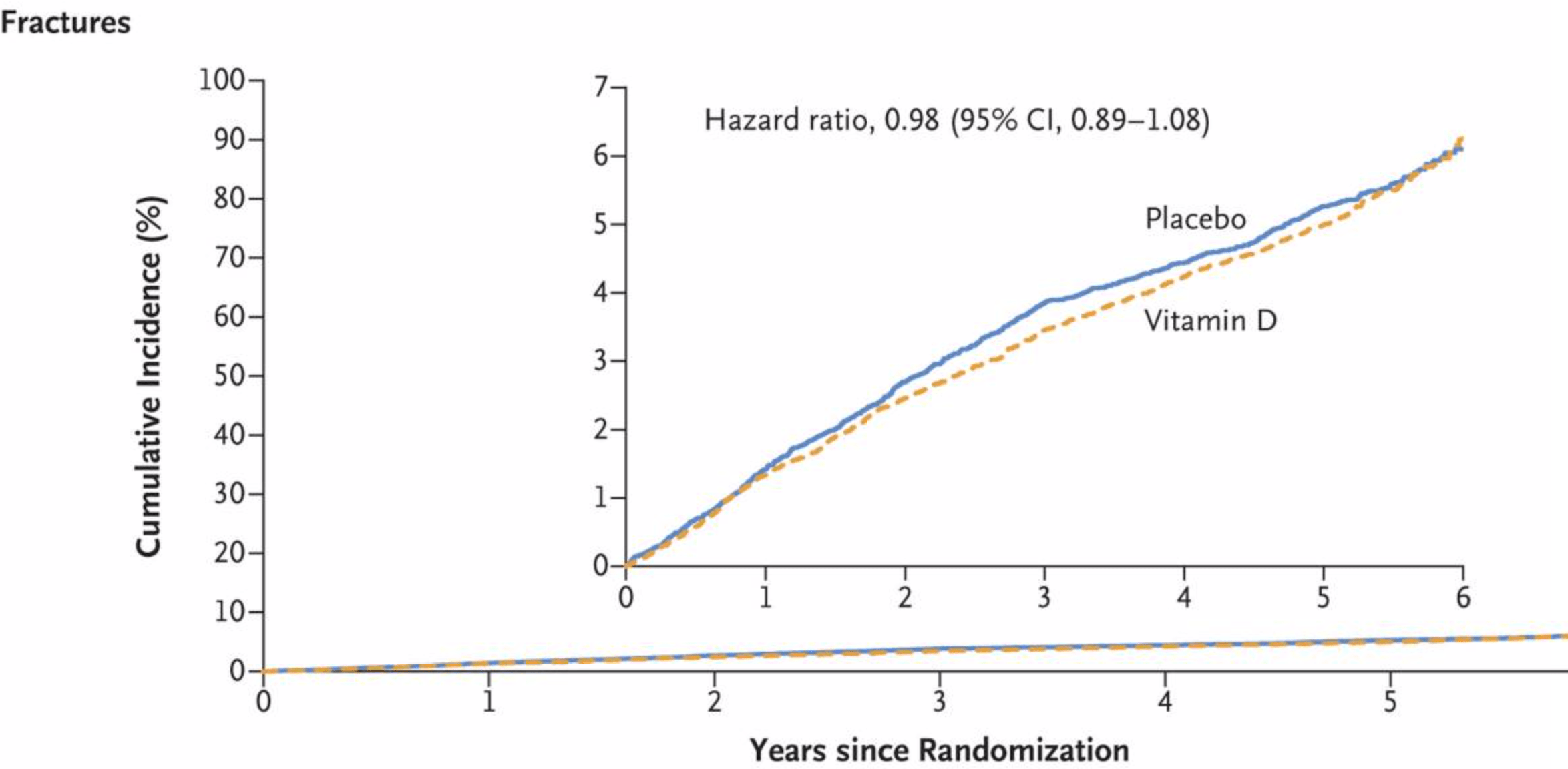 A recent nail in the coffin of vitamin supplementation was published in the New England Journal of Medicine. This was an ancillary analysis of a large randomized controlled trial of vitamin D, the VITAL study. VITAL originally aimed to find out whether vitamin D and omega-3 fatty acid supplementation decreased the risk of cardiovascular disease and cancer in healthy older adults who were not screened for low vitamin D levels (spoiler, they don’t). In the recent NEJM paper, the authors wanted to find out whether vitamin D supplementation had any effect on bone fractures. This is an important question since many people take vitamin D believing it will help prevent osteoporosis and fractures. The recent study suggests that vitamin D supplementation is unhelpful for fractures.