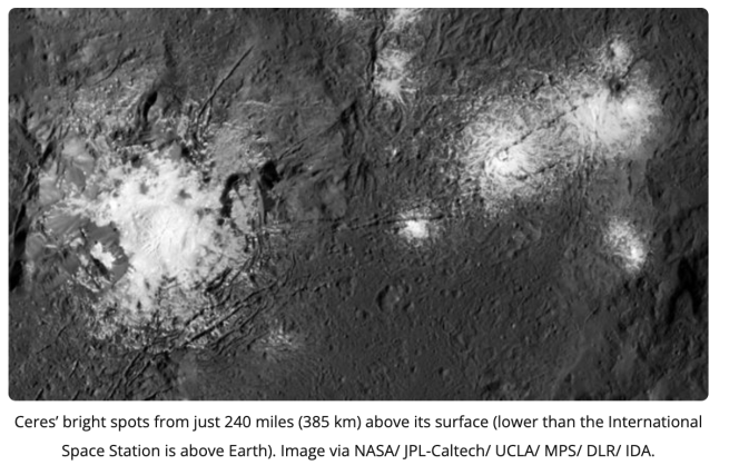 EarthSky.org – Ceres’ bright spots come from salty water below. Here is a closer and higher resolution image of the same phenomenon: