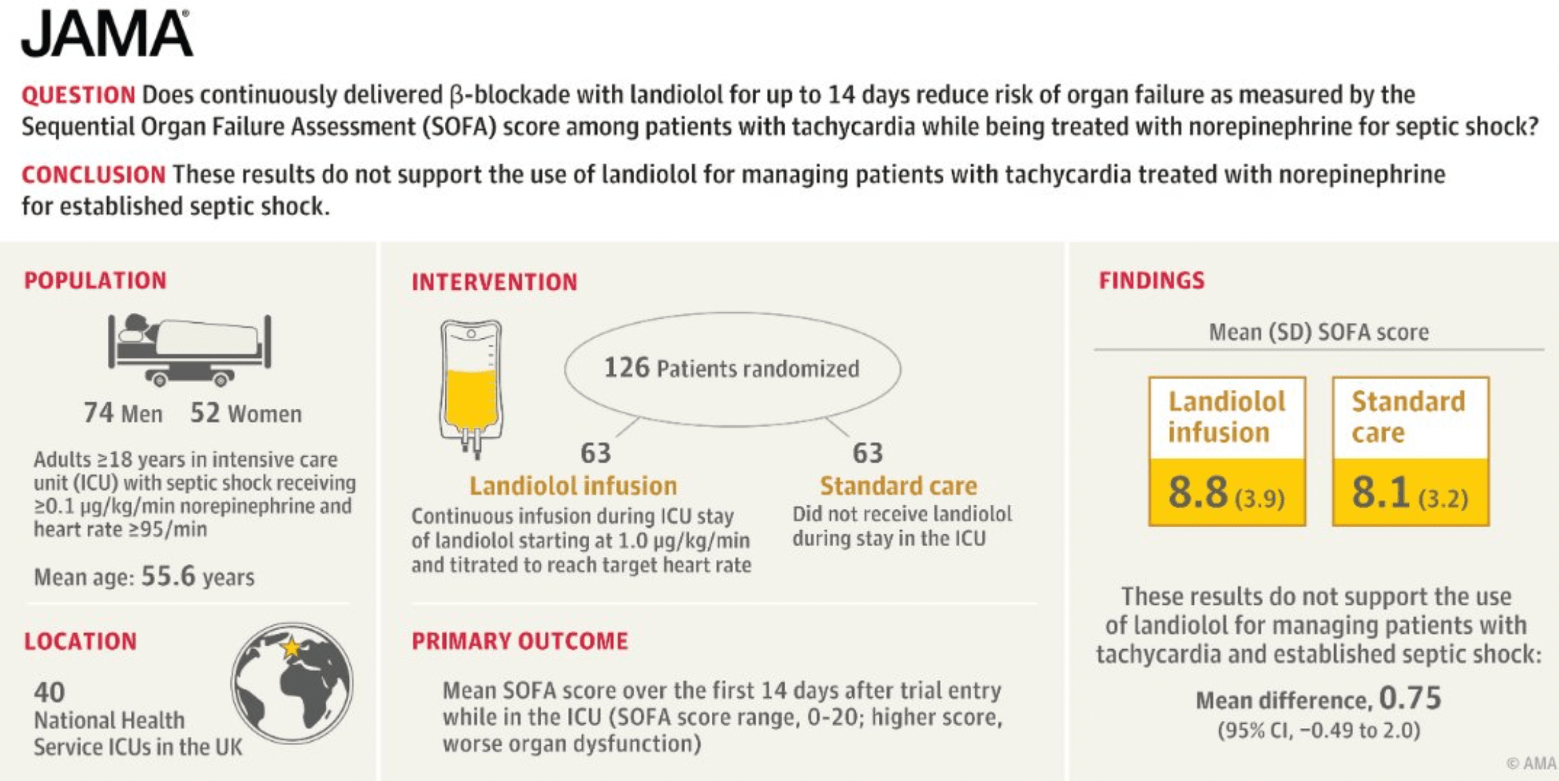 Beta blockers have the potential to mitigate several of the adverse physiological responses associated with sepsis. By reducing heart rate and myocardial contractility, beta blockers were proposed to improve myocardial oxygen supply-demand balance, decrease the risk of arrhythmias, and reduce the workload on the heart. This may be particularly beneficial in patients with sepsis-induced myocardial dysfunction. A previous open label study using esmolol pointed to a survival benefit for this drug in sepsis (Morelli et al 2013). This year a randomized controlled trial tested another beta blocker, landiolol, for septic patients with tachycardia. [Of course, tachycardia is defined as a heart rate above 100; the normal resting heart rate is 60-100.]