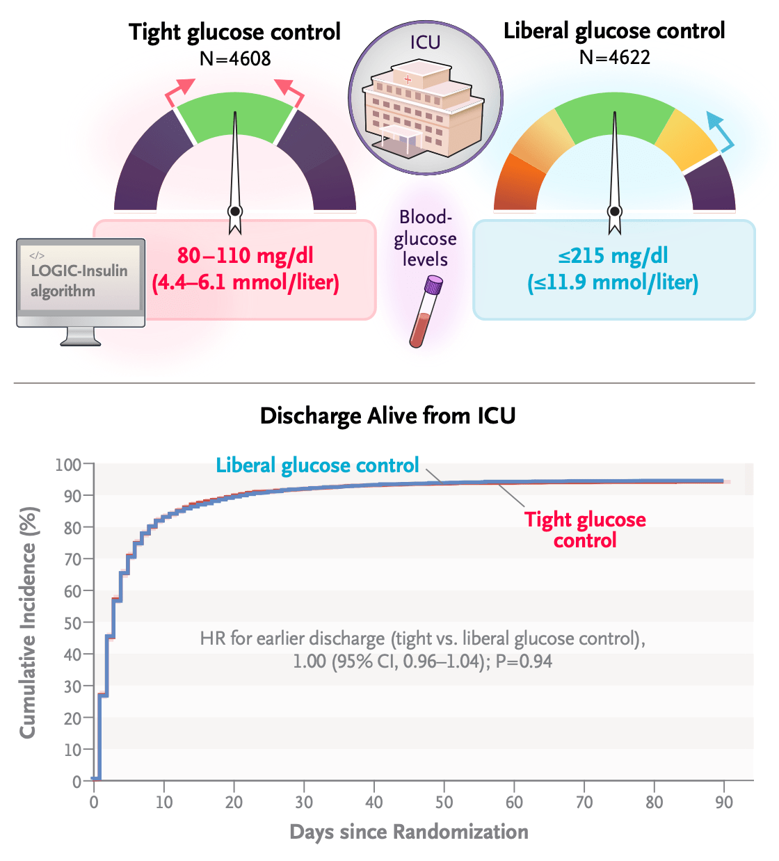 If you were wondering about this question, I have good news. The New England Journal of Medicine published a study in September 2023 that provides a partial answer. Gunst et al performed the largest trial to date of tight glycemic control for patients in the ICU. Tight glycemic control means using insulin to reduce the blood sugar to the level of a healthy fasting person, 80-110 mg/dl. The rationale for the trial, involving more than 9000 subjects, was that “hyperglycemia is common and is associated with a poor outcome” in patients receiving intensive care. This was attributed to “glucose toxicity in cells such as neurons, renal tubular cells, hepatocytes, and immune cells.”