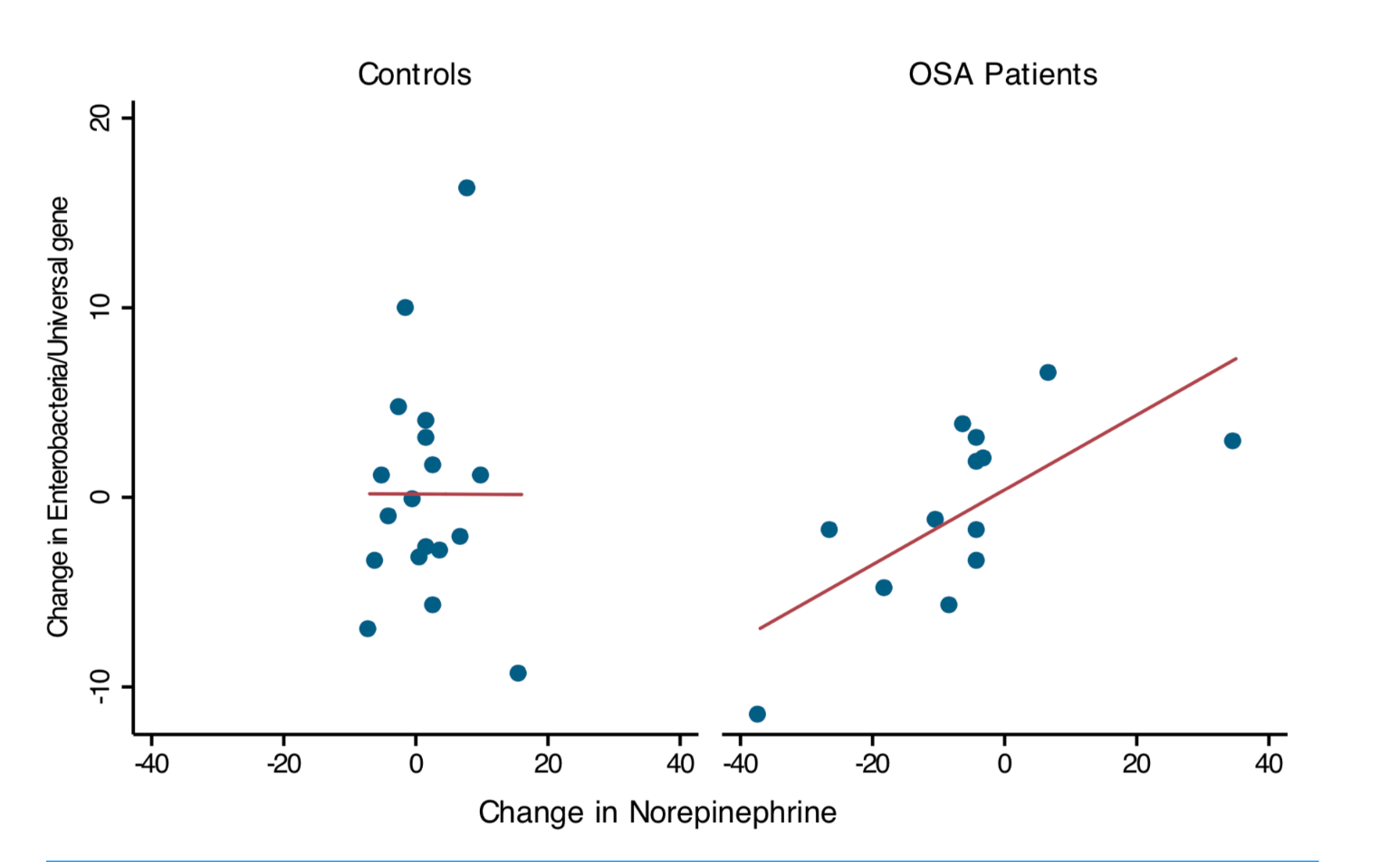 This was not linked to changes in intestinal inflammation or to the severity of the sleep apnea, as measured by the apnea/hypopnea index. However, our study is the first to translate the robust preclinical literature showing adverse effects of catecholamines on gut pathogens to OSA, a common clinical condition typified by elevated catecholamines. We found a within-subject effect when we looked at longitudinal changes in enterobacteria measured by qPCR and longitudinal changes in norepinephrine. These changes were absent in controls.