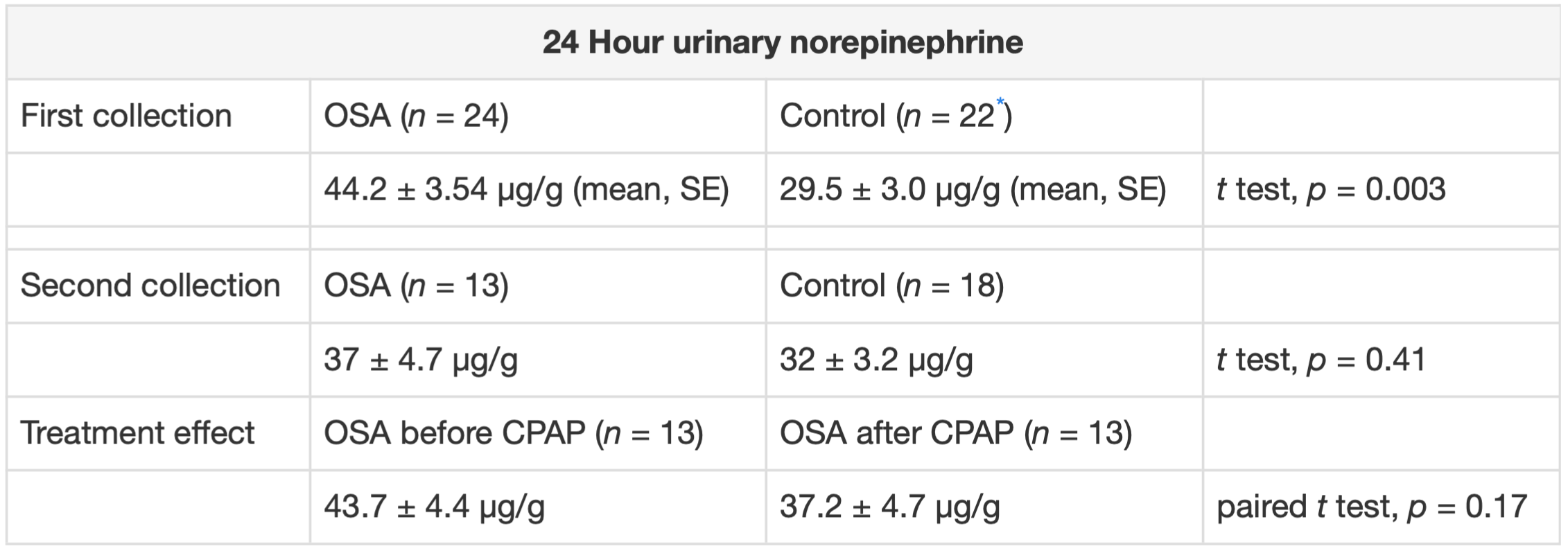 In our study, we found that urinary norepinephrine was higher in untreated OSA patients as compared to controls. Treated OSA patients had similar NE levels to controls.