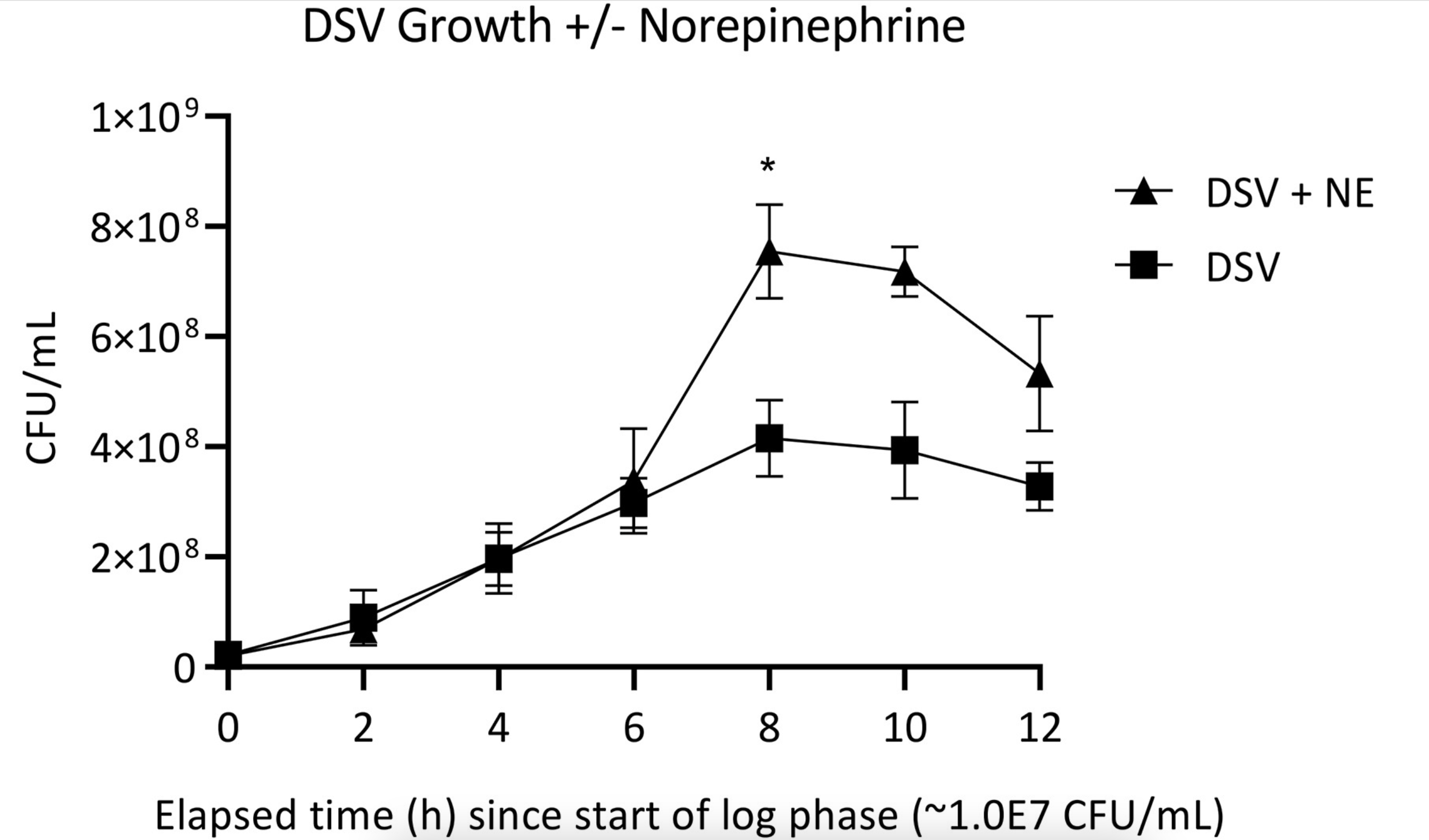 Three years ago, in a separate study, our group showed that norepinephrine stimulates the growth of Desulfovibrio vulgaris. DSV is a gram negative pathobiont (potential pathogen):