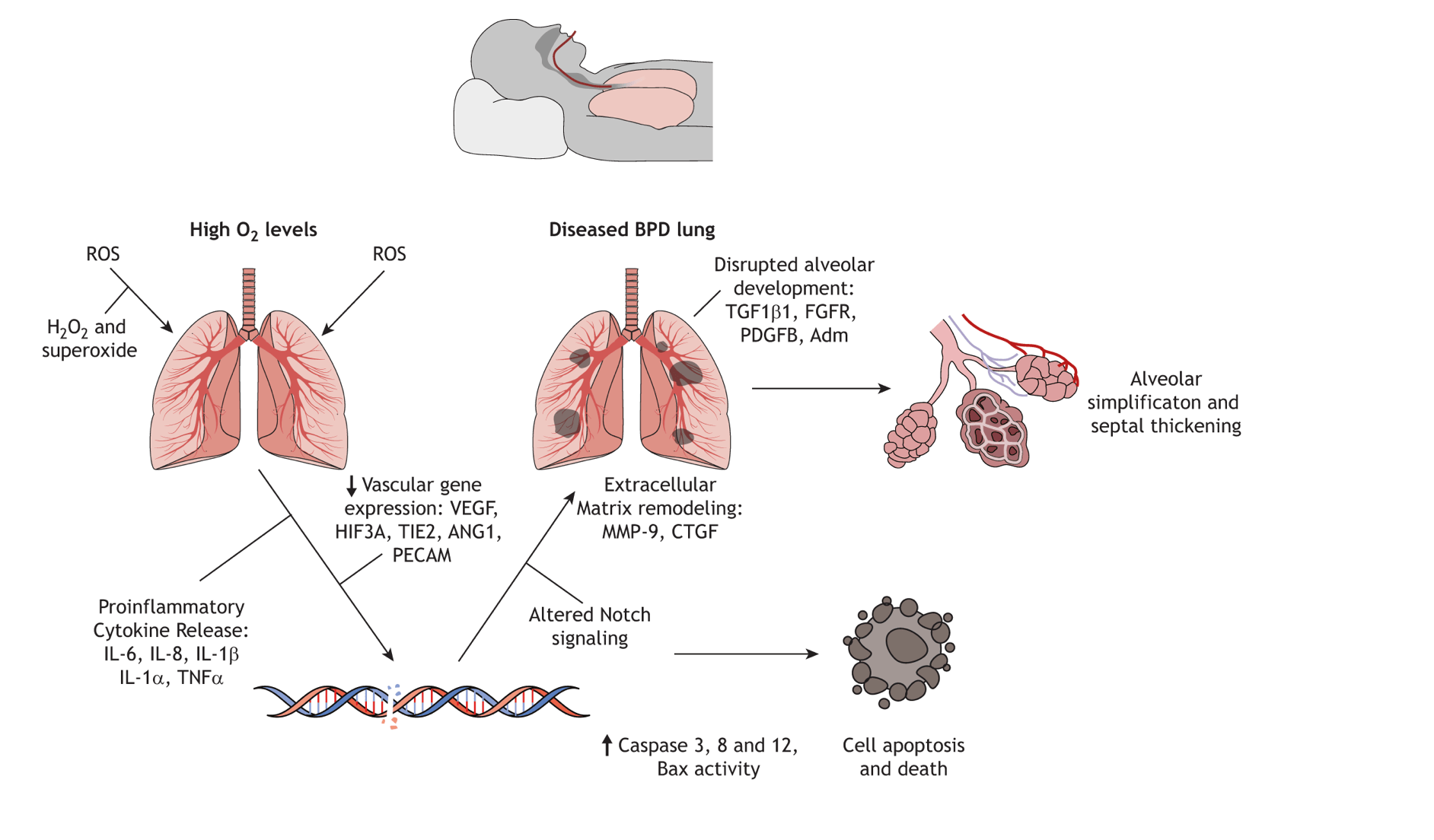 Premature infants especially have high oxygen requirements since their immature lungs lack surfactant and cannot take up oxygen efficiently. These babies need high O2 at a stage of life when oxygen regulates blood vessel development. Unfortunately this leads to bronchopulmonary dysplasia (BPD), and retinopathy of prematurity (ROP) as a consequence of high O2. These problems result from suppression of hypoxia inducible factors that regulate alveolar and vascular development – a classic gene-environment mismatch.