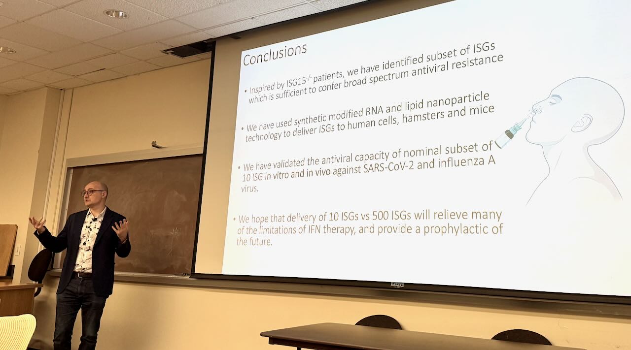 Bogunovic recently presented these findings in a talk at the University of New Mexico. He has shown that ISGs have potential as broad spectrum anti-virals, but only when given in combination. From the abstract in Science Translational Medicine: “A lipid nanoparticle-encapsulated messenger RNA (mRNA) formulation of this 10-ISG collection reduced influenza A virus plaque size in samples collected from infected mice when given prophylactically. Moreover, when used collectively and delivered prophylactically, the 10-ISG collection was able to protect hamsters against a lethal SARS-CoV-2 challenge, in contrast with the lack of efficacy when mRNAs were delivered individually. These findings suggest that these 10 ISGs have potential as a broad-spectrum antiviral prophylactic.”